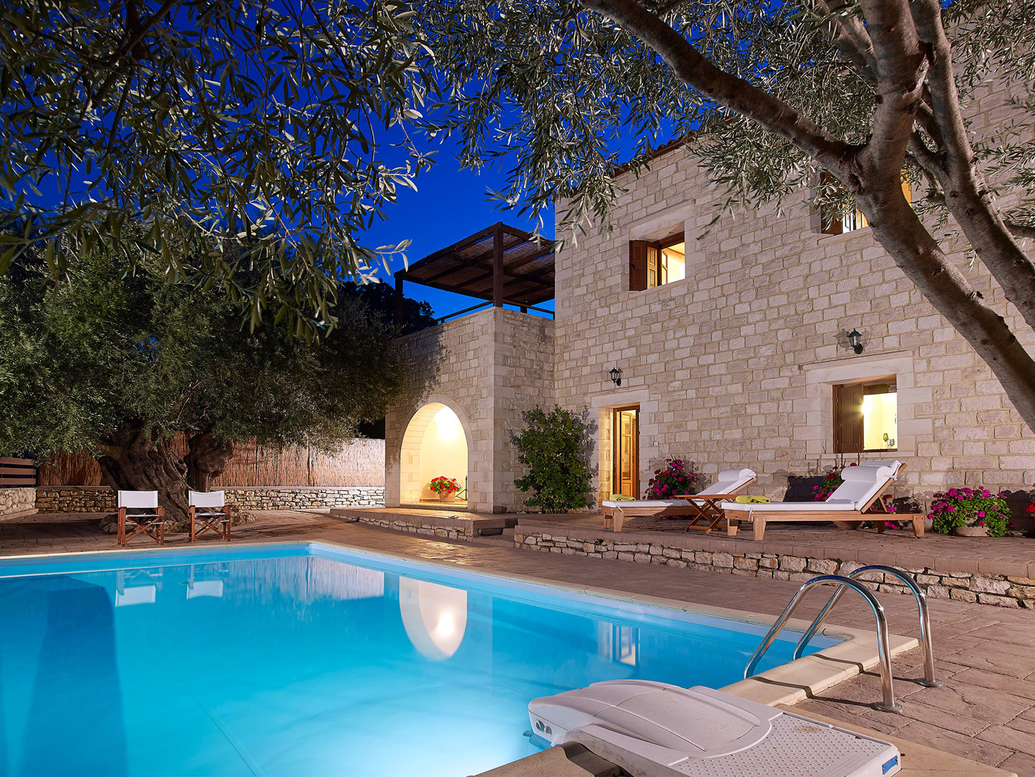 Indulge in elegance and comfort at this stunning stone retreat. Spacious interiors include comfortable bedrooms, and a fully equipped kitchen with vintage equipment. The ground-floor bedroom features a luxury en-suite bathroom with a jacuzzi, offering the ultimate space to relax and unwind. Outdoors, enjoy the private pool, lush gardens with hundred years old olive trees and a shaded dining area, perfect for a serene and luxurious escape.